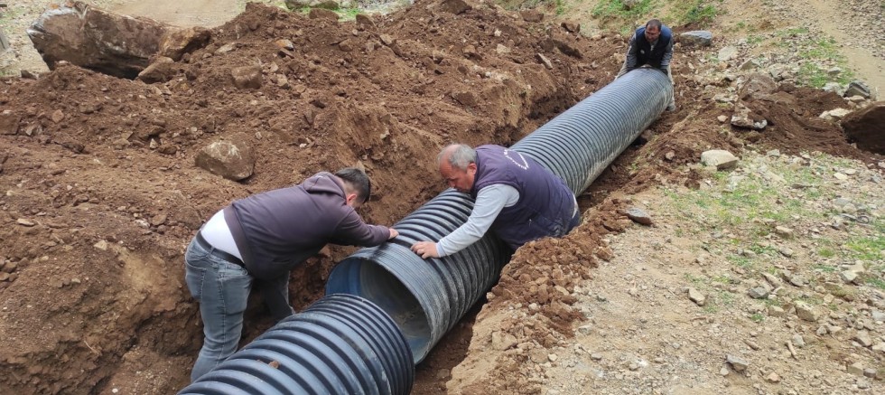 Kurucaoluk’un yayla yolunda, yağmur suyu geçişleri için 4 ayrı yere koruge boru montajı