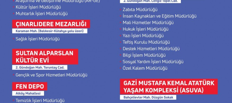 Altıeylül Belediye Başkanı Hasan Avcı, "Birimlerimizi kendi hizmet binalarımıza taşıdık. Yeni binamız yapılana kadar birimlerimiz; Hasan Can Kültür Merkezi, Sultan Abdülhamid Han Gelişim Merkezi, Gazi Mustafa Kemal Atatürk Yaşam Kompleksi, Sultan Alpaslan Kültür Evi, Paşaköy'de bulunan depomuz, Çınarlıdere Mezarlığımız ve Pamukçu Hizmet binamızda hizmet vermeye devam edecekler.