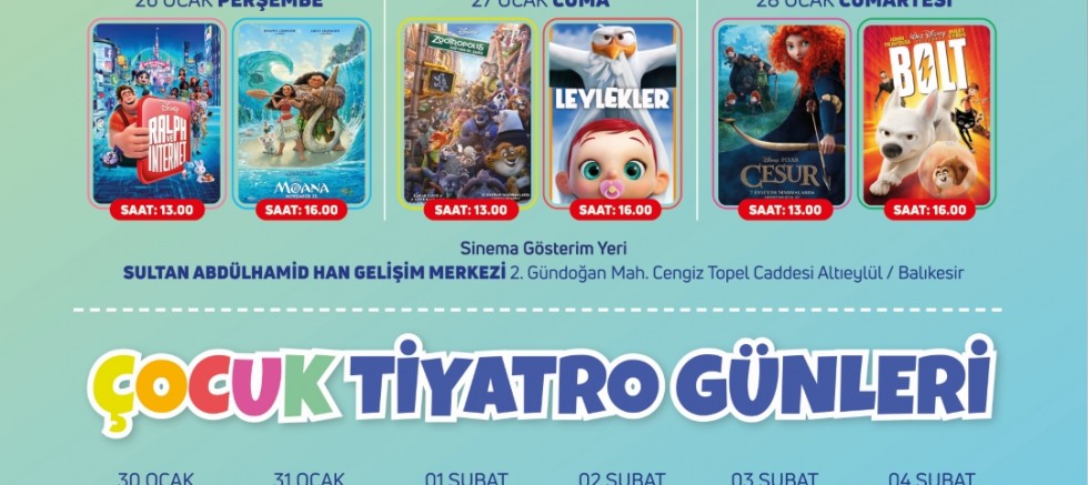 Altıeylül Belediyesi, bu hafta yarıyıl tatiline girecek çocuklar ve aileleri için Sultan Abdülhamid Han Gelişim Merkezi ve Hasan Can Kültür Merkezinde “Tatil Altıeylül’de Güzel” sloganıyla birbirinden renkli etkinlikler düzenliyor. Etkinlikler 23 Ocak’ta Sultan Abdülhamid Han Gelişim Merkezinde çocuk ve yetişkin filmleri ile başlıyor. Ralph ve İnternet, Moana, Hayvanlar Şehri, Leylekler, Cesur ve Bolt adlı çocuk filmleri 28 Ocak Cumartesi gününe kadar saat 13:00 ve 16:00’da olmak üzere iki seans gösterimde olacak.